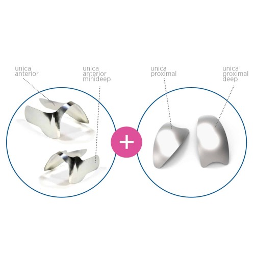 Komplexní řešení pro dokonalou kontrolu nad rekonstrukcemi předních zubů. Unica Master Kit nabízí výběr základních nástrojů pro kompletní kontrolu nad rekonstrukcemi předních zubů. Tento systém zahrnuje Unica a Unica Minideep matrice pro přední zuby, Unica Proximal a Unica Proximal Deep, stejně jako různé myWedges, které lze použít podle potřeby. Výběr produktů pokrývá širokou škálu indikací: od přímého nanášení kompozitních venýrů (parciálních i celkových) a tvarových úprav (např. uzavření diastematu nebo obnova tvaru lateralních řezáků) až po rekonstrukce tříd III. až V. u předních zubů. Unica a Unica Minideep matrice jsou velmi užitečné v náročných případech, které vyžadují obnovu cervikální a proximální oblasti (celkový venýr). Unica Proximal je ideální matrice pro obnovu pouze mezizubních okrajů, bez zasahování do cervikální oblasti, což je nezbytné v případech, kdy je přístup bez překážek a jasná viditelnost klíčová pro úspěšný postup – i když pracujete mezi kontaktně na obou stranách zubu zároveň. Produkty jsou dodávány v nové luxusní krabičce s logem Polydentia, která obsahuje znovu použitelné vaničky pro snadné a přehledné uskladnění jednotlivých jednotek. Krabička a vaničky jsou navrženy tak, aby se vešly do zásuvek skříněk pro bezpečné uložení a jsou vyrobeny z recyklovatelných a snadno čistitelných materiálů.